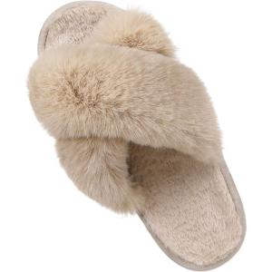 Comwarm Women’s Cross Band Fuzzy Slippers Fluffy Open Toe House Slippers Cozy Plush Bedroom Shoes Indoor Outdoor, Camel Size 7-8