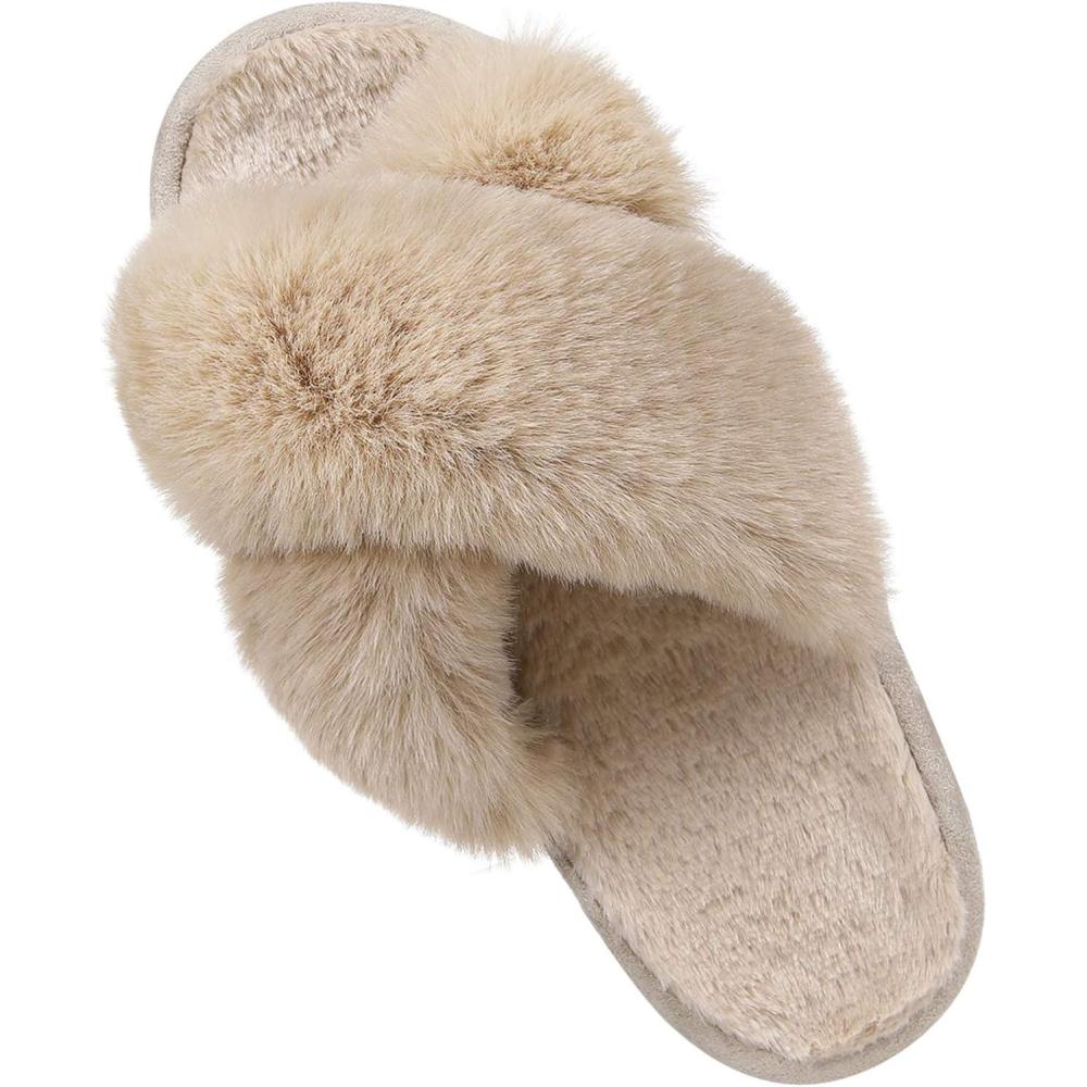 Comwarm Women’s Cross Band Fuzzy Slippers Fluffy Open Toe House Slippers Cozy Plush Bedroom Shoes Indoor Outdoor(Camel)