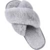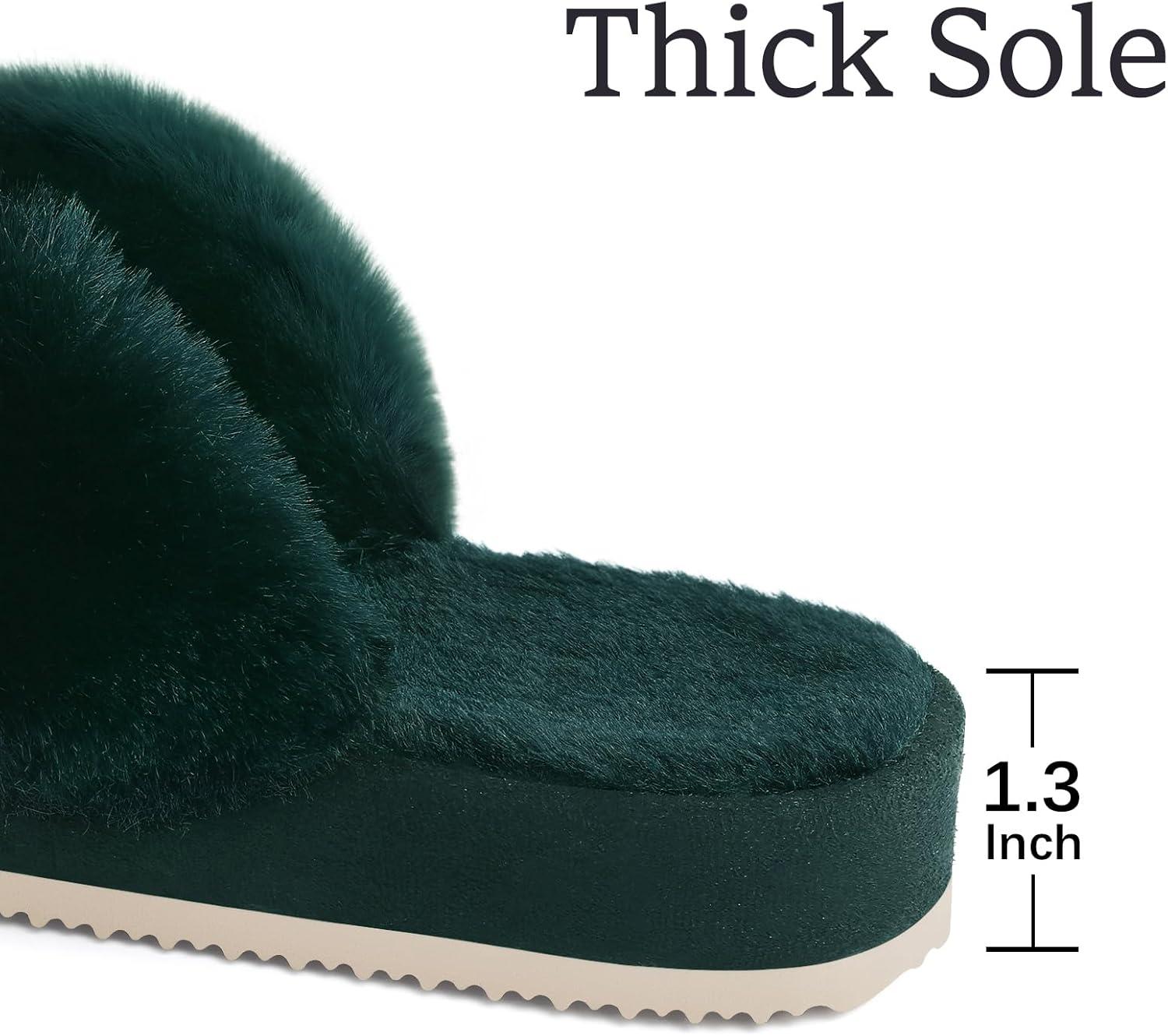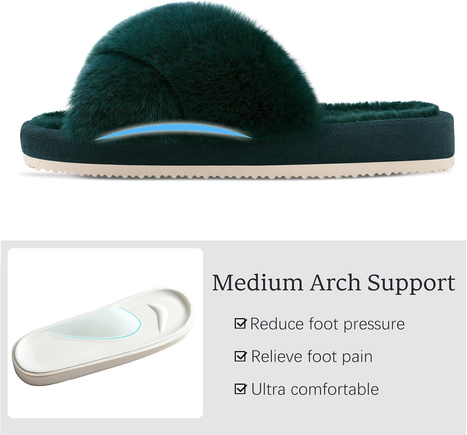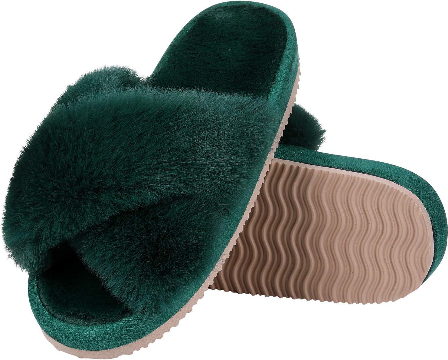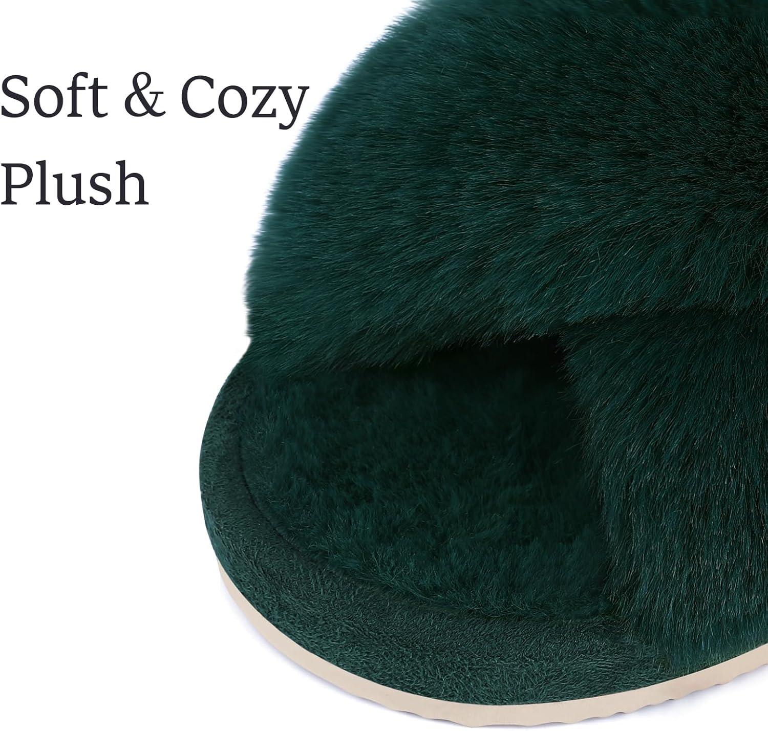 Comwarm Women’s Cross Band Fuzzy Slippers Fluffy Open Toe House Slippers Cozy Plush Bedroom Shoes Indoor Outdoor(Green)