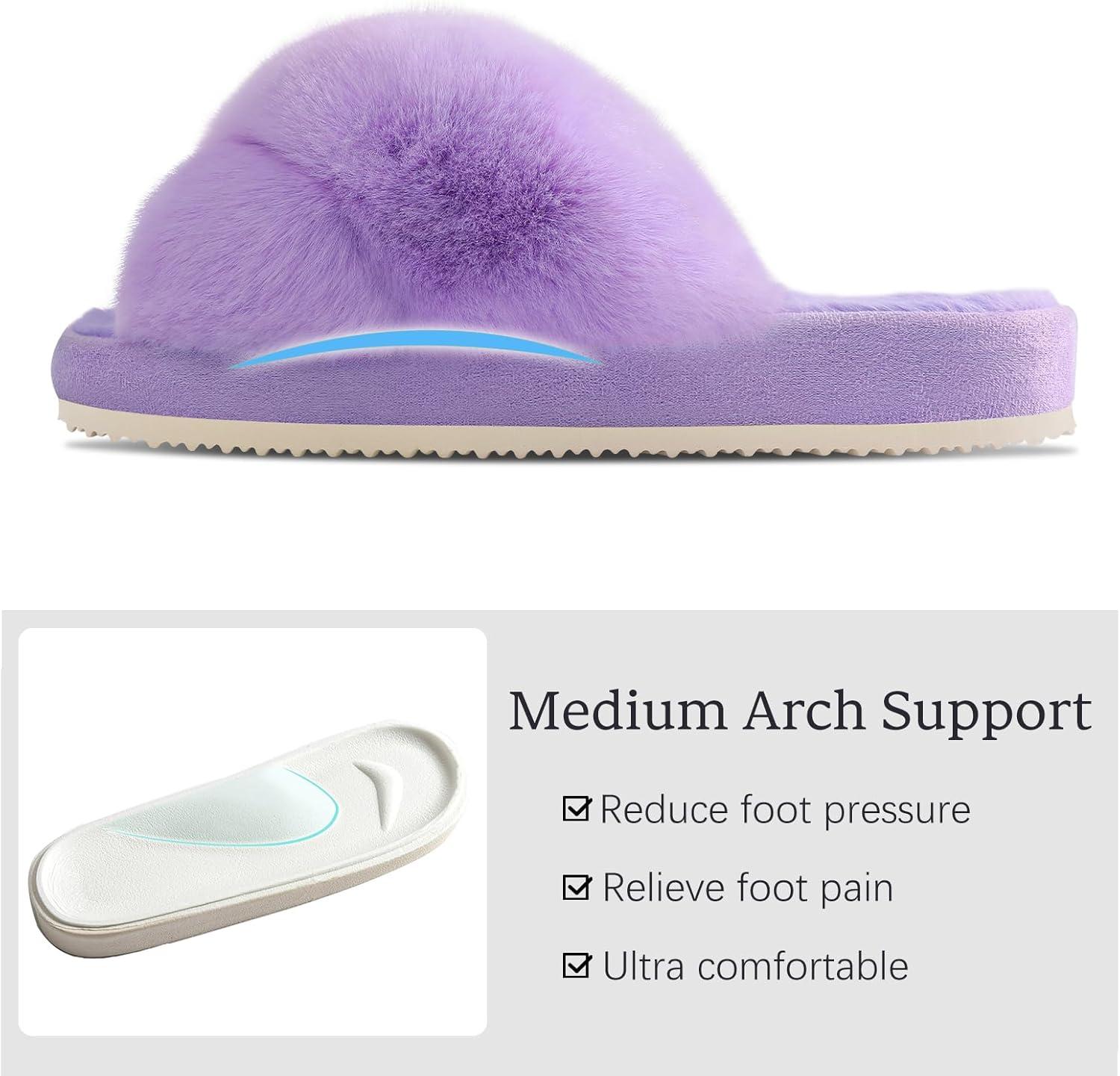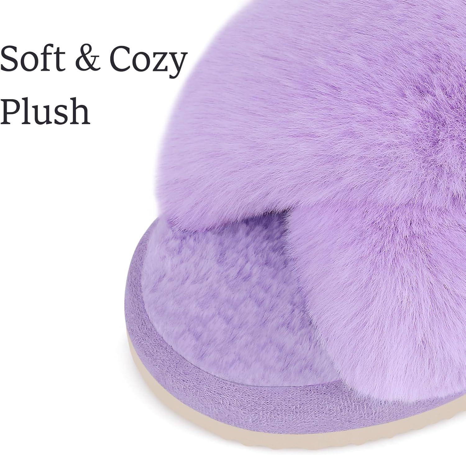 Comwarm Women’s Cross Band Fuzzy Slippers Fluffy Open Toe House Slippers Cozy Plush Bedroom Shoes Indoor Outdoor(Purple)
