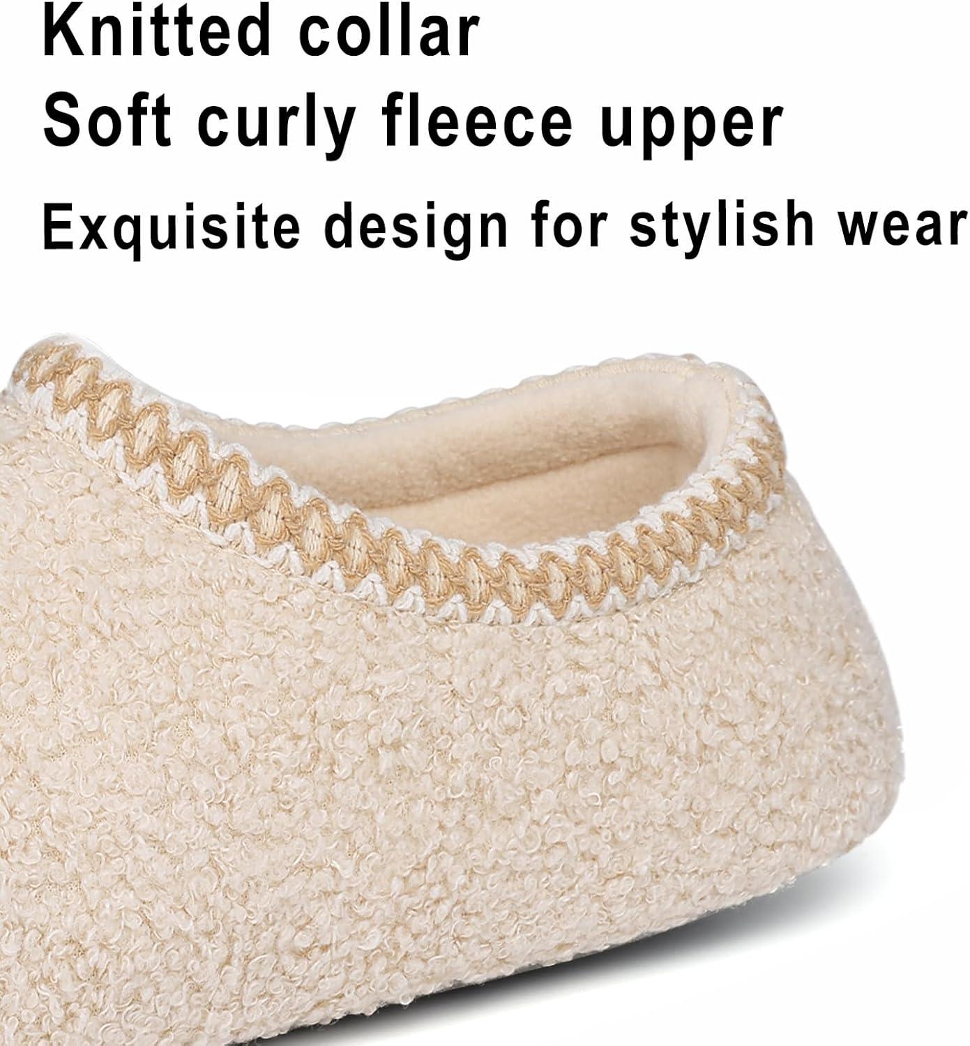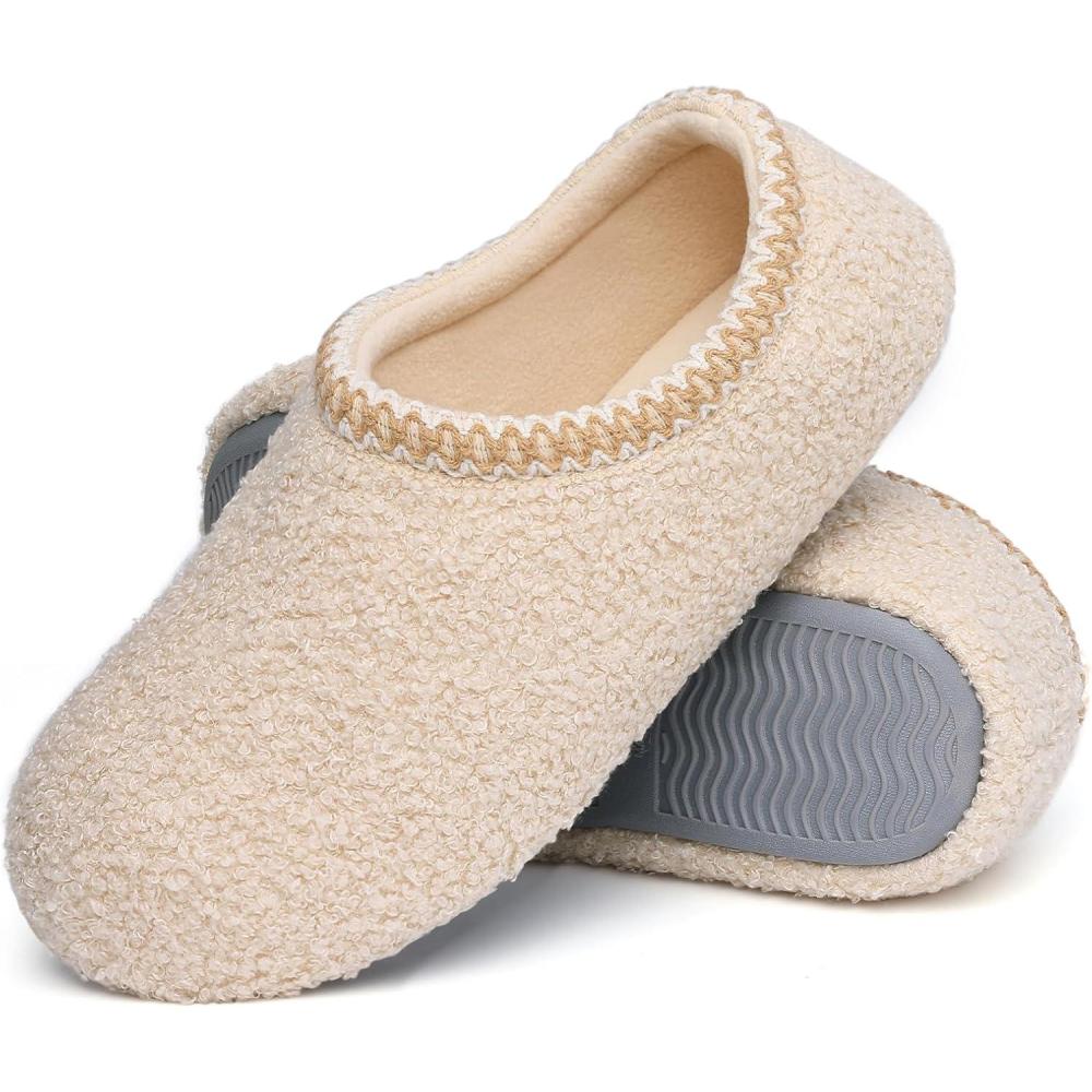 shevalues Women House Memory Foam Slippers Teddy Fleece Bedroom Sock Shoes with Soft Rubber Sole(Beige)