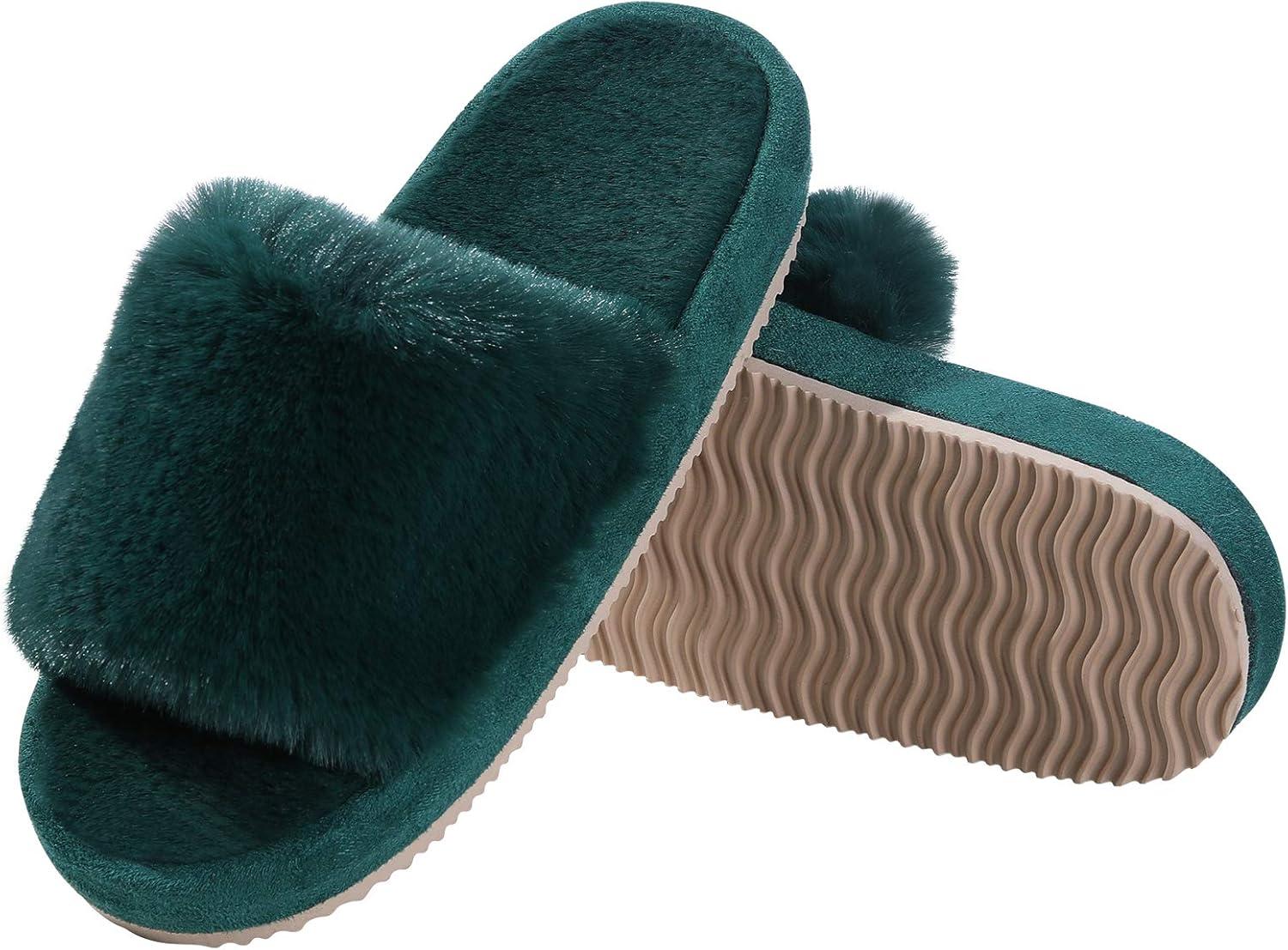 Women Fuzzy Fluffy Slippers Open Toe Light Cozy Slip on House Slippers Indoor Outdoor Slippers